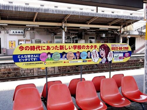 岐阜県の通信制高校 「中京高校」様と その直営サポート校「へいせい義塾館高等学院」様の 本拠地、JR瑞浪駅に「ベンチ広告」を本日26日午後設置いたしました。 ちょっとでも目立たせようと 黄色でデザインしましたよ。 駅で見かけたら 立ち止まって声に出し…