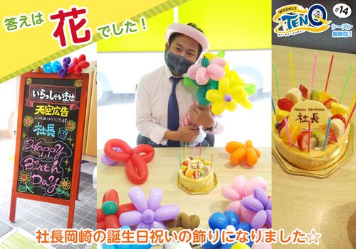 おはようございます! 先週のWEEKLY TENQ最終回、バルーンアートで何を作ったか分かりましたでしょうか?? 答え合わせです! 岡崎社長、お誕生日おめでとうございました☆ 皆さまご参加ありがとうございました! 獲得pt数はただいま集計中です。週明け月曜日…