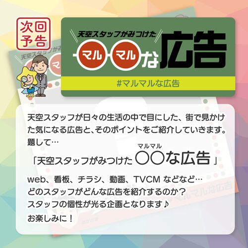 広告屋なのでアンテナは大きく広く張っていきたいものです。来週から新しい企画が始まります! 天空スタッフがみつけた ○○な広告 「○○」部分は、「マルマル」と読みます。タイトル通り、天空スタッフが街中で見かけたり、テレビや動画で見かけたり、webペー…