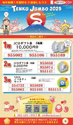 明けましておめでとうございます。 今年も開催させていただいております、『TENKU JUMBO 2025』の天空広告からの年賀状はお手元にご用意できましたか?宛名面の右下にあるお年玉のくじの番号が、2ページ目以降に発表する番号と一致したら大当たり!当選され…